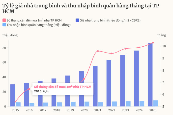 Thống kê từ CBRE củng cố nhận định này: sau 10 năm, giá nhà bình quân tại TP.HCM đã tăng gần 3 lần, từ 30 triệu đồng/m² lên 86 triệu đồng/m². Trong khi đó, thu nhập người lao động chỉ tăng khoảng 1,5 lần, theo số liệu của Tổng cục Thống kê.