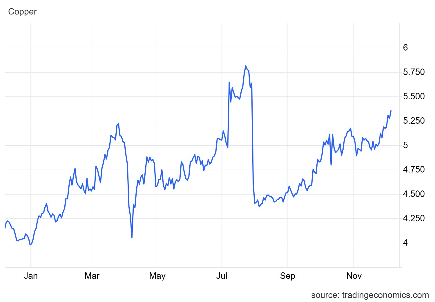 Trong phiên giao dịch ngày 5/12, đồng đã thiết lập mức đỉnh mới khi thị trường phản ứng trước nguy cơ thiếu hụt nguồn cung cũng như kỳ vọng Cục Dự trữ Liên bang Mỹ (FED) sẽ bắt đầu chu kỳ hạ lãi suất trong tuần tới. Diễn biến này đang tiếp thêm lực cho xu hướng tăng của một trong những kim loại quan trọng nhất đối với hoạt động sản xuất và công nghiệp toàn cầu.